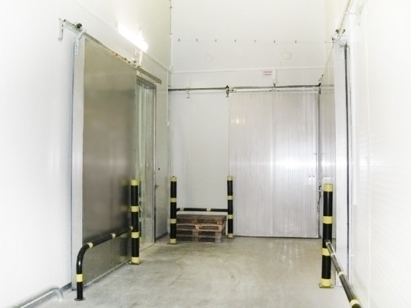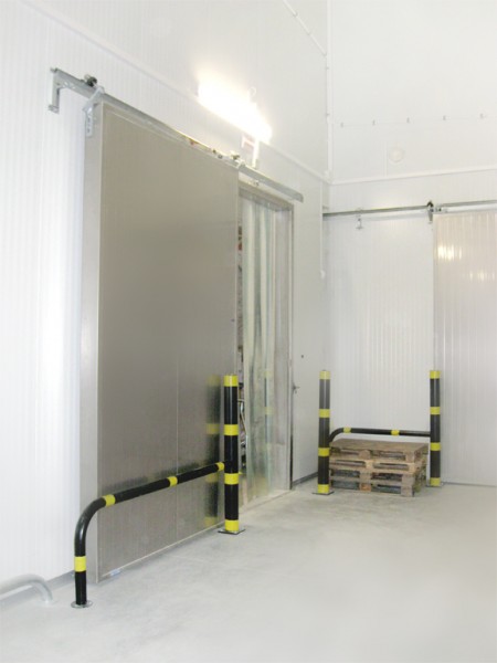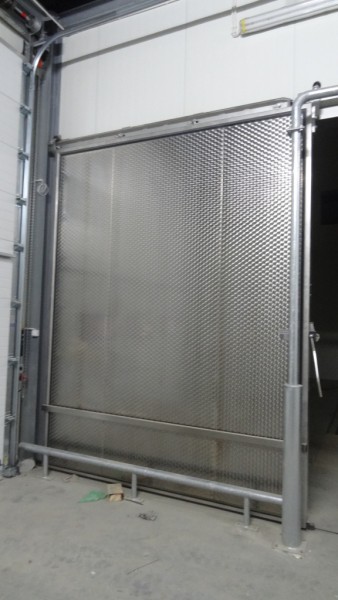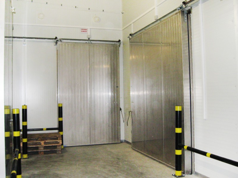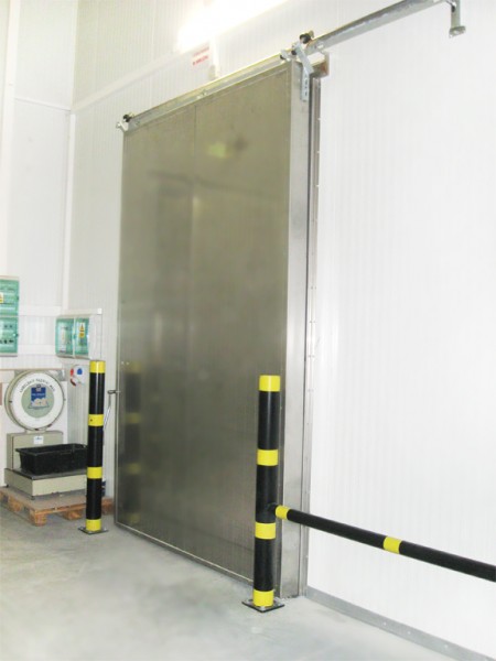 Drzwi przesuwne, otwierane w prawo lub w lewo bądz w pionie , obramowania i ościeżnice wykonane są z blachy kwasoodpornej o odpowiedniej grubości zapewniającej dużą stabilność płata drzwiowego ( sztywność drzwi pozwala na wykonanie w dużych gabarytach drzwi mrozniczych bez utraty szczelności.